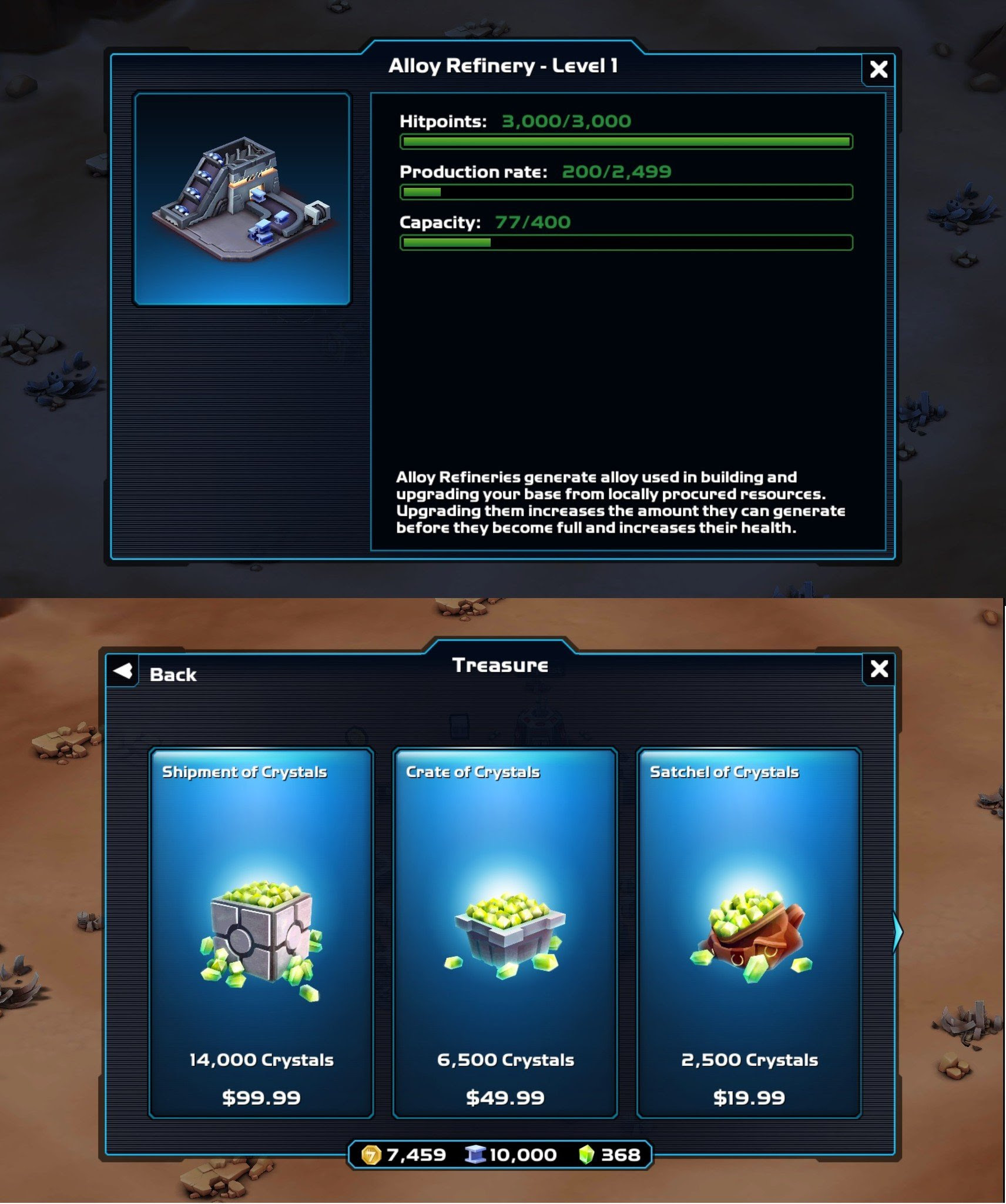 Resources are an integral function in how this game works. You'll need certain amount of resources to ever upgrade your buildings, or construct new ones. Your main resources come in form of Alloy and Credits, but you'll also need to keep an eye on your supply of crystals as well as how many droids you employ.