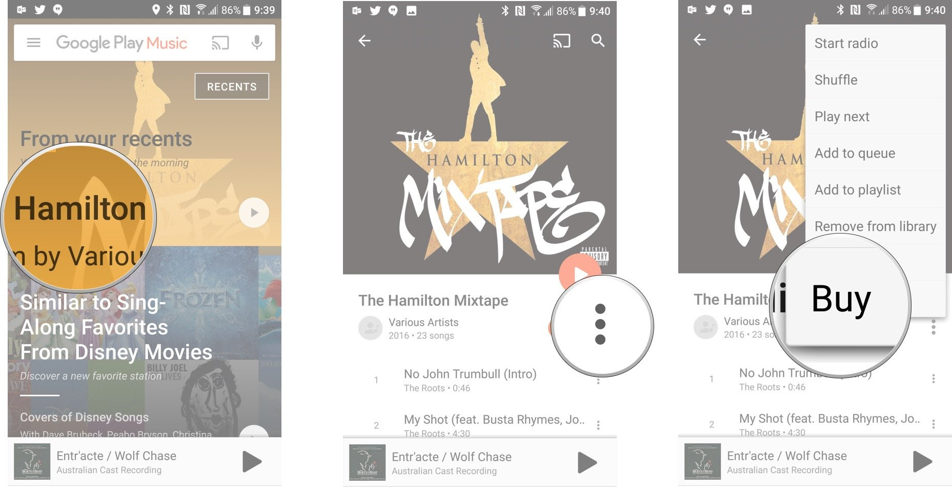 Today, it's easier to purchase music than ever. Google Play Music allows you to quickly buy music you come across in the app, letting you expand your personal library without taking you out of the listening experience.